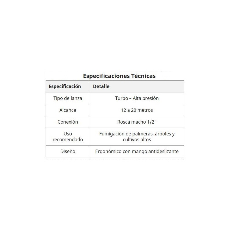 GRAN ALCANCE: Proyección efectiva de entre 12 y 20 metros, ideal para llegar a zonas altas con precisión (el alcance depende de la bomba utilizada).
