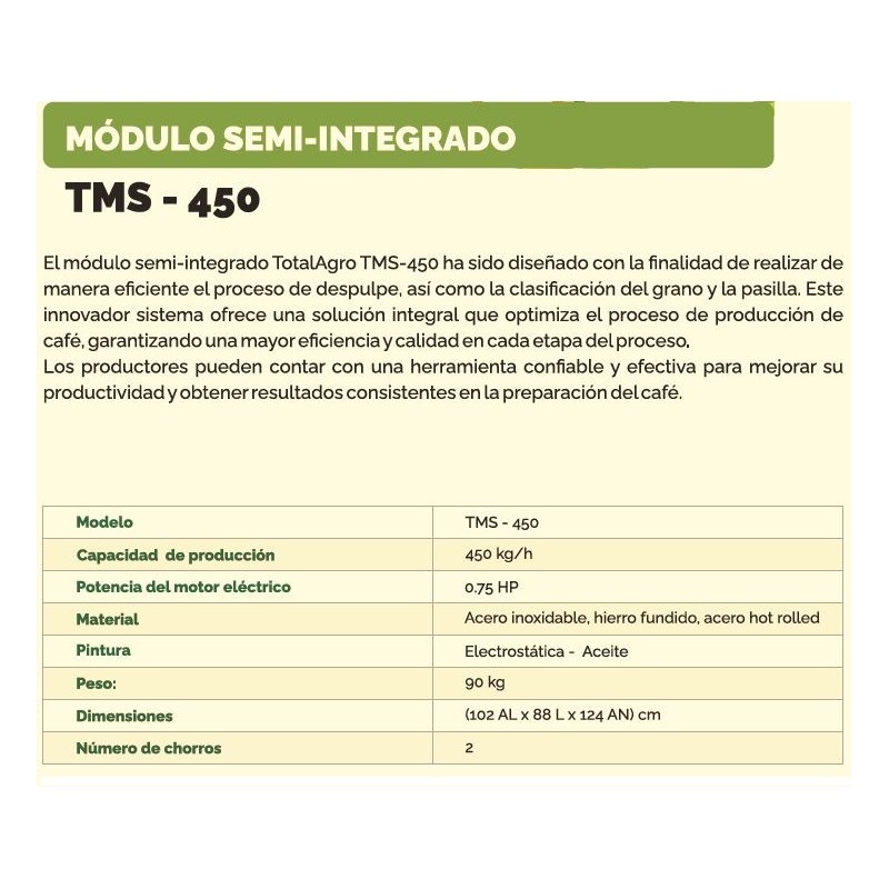 Módulo semi-integrado, TMS – 450 capacidad de 400 A 500 kg/h, material de cobre fundición, HR e inoxidable, numero de chorros 2, diámetro de volante 16”, polea de motor 2”, peso de la maquina 90kg, incluye base para motor electrico Nota: no incluye polea, motor, ni correa