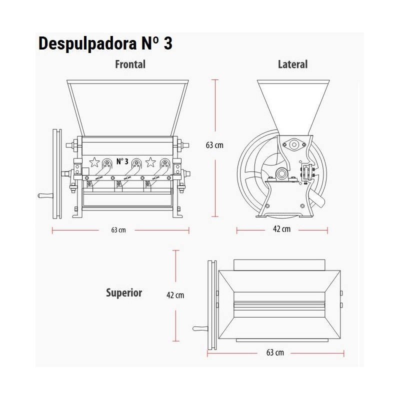 Capacidad 700-1.000 kilos de café cereza/hora. Incluye:Despulpadora Horizontal DH-3 1/2, costados y cilindro en fundición, camisa en cobre,zaranda en lámina troquelada, bandeja salida de café despulpado, canal salida pulpa,canal salida café pasilla en acero inoxidable, estructura en ángulo, base para motoreléctrico y/o gasolina. No incluye motor, ni...