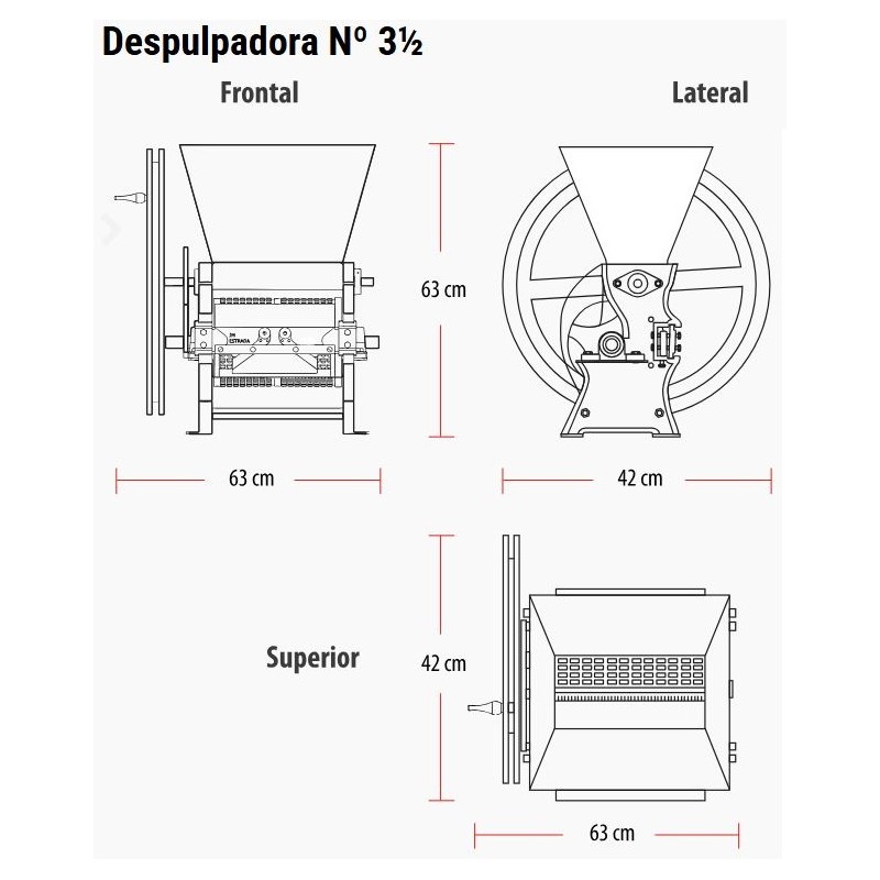 Capacidad 700-1.000 kilos de café cereza/hora. Incluye:Despulpadora Horizontal DH-3 1/2, costados y cilindro en fundición, camisa en cobre,zaranda en lámina troquelada, bandeja salida de café despulpado, canal salida pulpa,canal salida café pasilla en acero inoxidable, estructura en ángulo, base para motoreléctrico y/o gasolina. No incluye motor, ni...