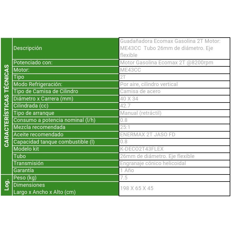 Marca: ECOMAX, Cilindrada: 42.7cc, Capacidad del tanque: 0.8 Lts, Tubo: 28mm de diametro. Eje Flexible.