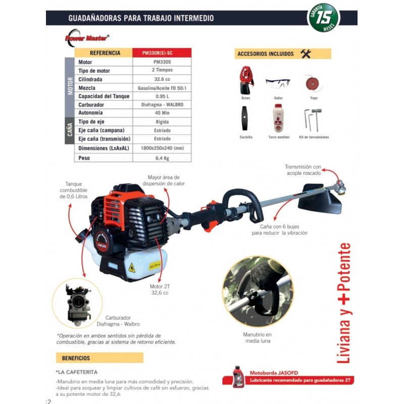 La Guadañadora Cafeterita Power Master PM330R(S)-SC es la herramienta ideal para zoque y limpieza de cultivos de café. También se ajusta para quienes buscan eficiencia y potencia en el cuidado de jardines y áreas verdes. Con un motor de 2 tiempos y una cilindrada de 32.6 cc, esta guadañadora cafeterita ofrece una potencia que asegura un rendimiento excepcional en cada uso.