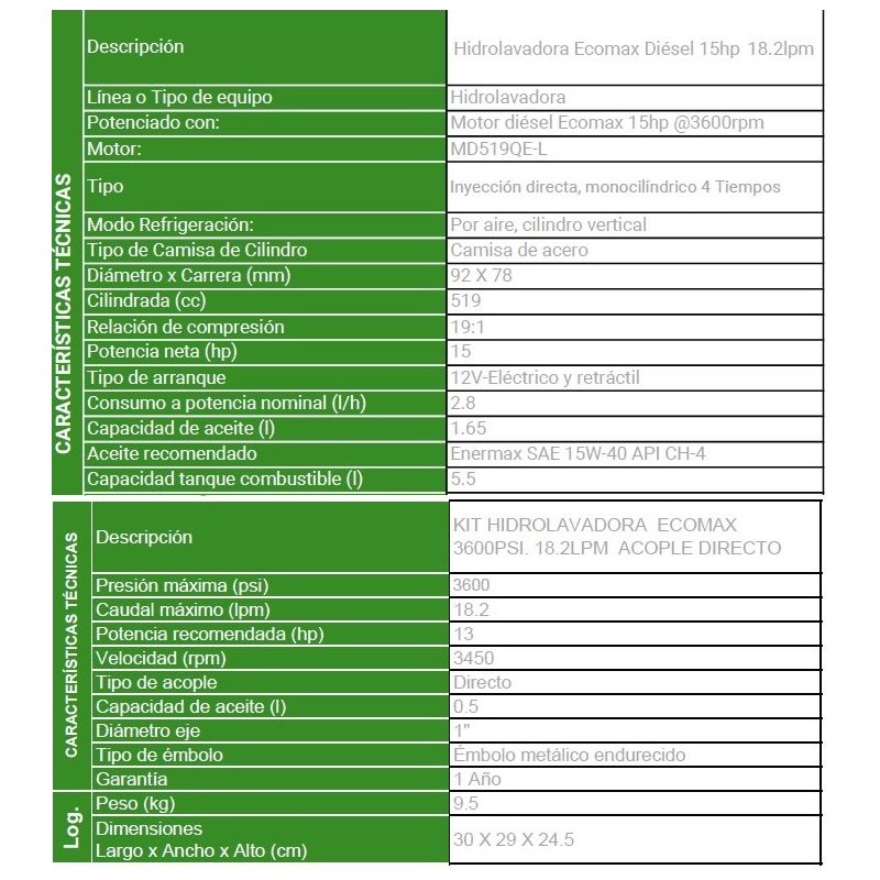 MARCA: Ecomax Potenciado por: Diésel Potencia neta (hp): 15 Presión máxima (psi): 3600 Caudal máximo (lpm): 18.2