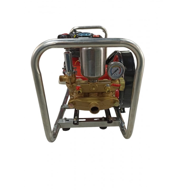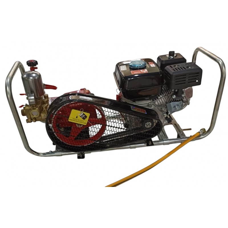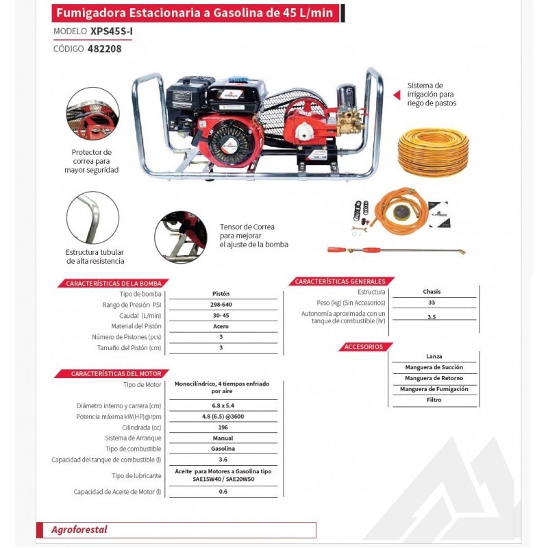 Está equipada con un motor Fujita a gasolina de 4 tiempos y 6.5 caballos de fuerza y una bomba con tres pistones de acero inoxidable de 30 lts Incluye Manguera de descarga * 100 Mts, lanza recta de 90cm, llave para juste de pistones, llave de bujía, manguera de succión, manguera de retorno y kit para sello de la bomba.