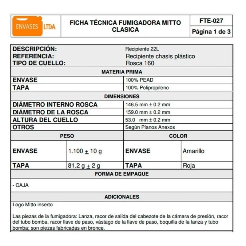 | Peso del envase | 1.100 g ± 10 g |
