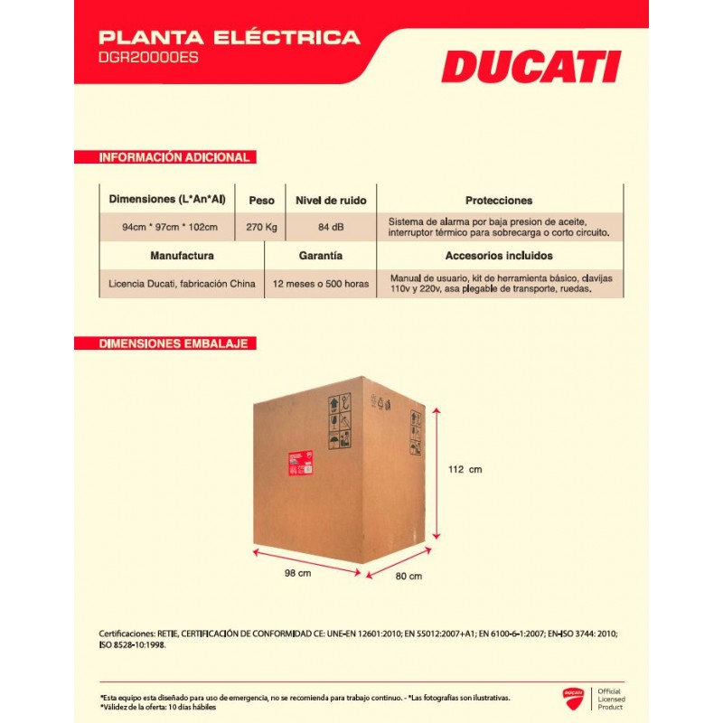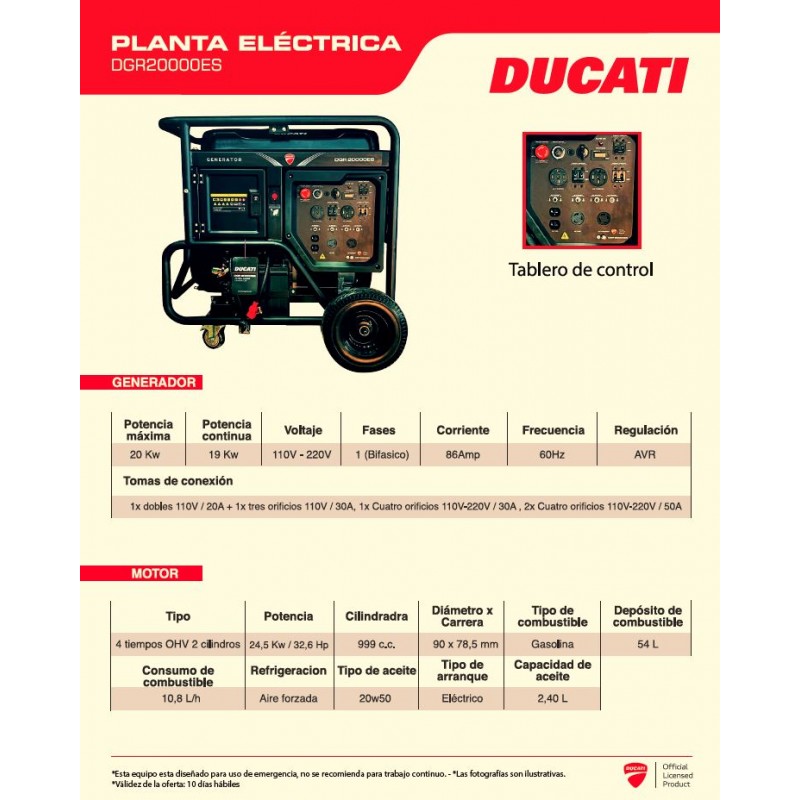 Potencia, seguridad y rendimiento en una sola máquina. La planta eléctrica a gasolina DUCATI de 20 kW está diseñada para brindar energía confiable en aplicaciones industriales, comerciales o residenciales exigentes. Ofrece una potencia máxima de 20 kW y nominal de 19 kW, con conexión bifásica y capacidad de entrega de hasta 86 amperios.