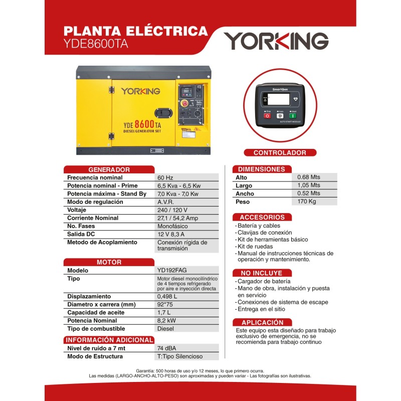 Planta Eléctrica Diésel Yorking 7.0kVA 120/240V 1F YDE8600TA, generador portátil con tablero digital, cuenta con funcionamiento a base de diésel que trabaja con un poderoso motor y encendido eléctrico, de rendimiento continuo en todo tipo de uso, ya sea en usos eventuales o de emergencia, con un consumo de combustible 1.81 litros/hora y potencia prime.