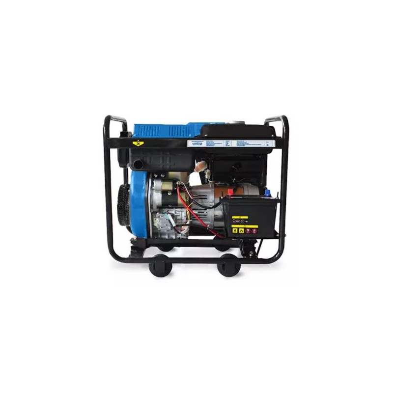 Generador eléctrico Diésel Power Master, ideal para uso en emergencias con cargas básicas. • Generador de encendido eléctrico y manual. • Incluye cargador de baterías. • Sensor luminoso de bajo nivel de aceite y protector de sobrecarga. • Voltímetro. • Debe ser operada en lugares abiertos y/o ventilados. • Cuenta con llantas.