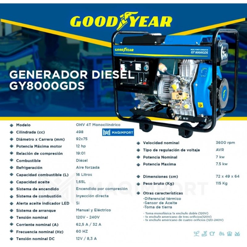 Planta Eléctrica Diésel GoodYear 7.5Kw 120/240v 1f GY80001GDS, arranque eléctrico, ofrece una potencia máxima de 7,5 kW y nominal de 7 kW, operando tanto en 120 V como en 240 V con frecuencia de 60 Hz. Además de sus tomas principales, incluye salida DC de 12 V / 8,3 A, regulador automático de voltaje (AVR), voltímetro analógico, sensor de aceite y sistema...