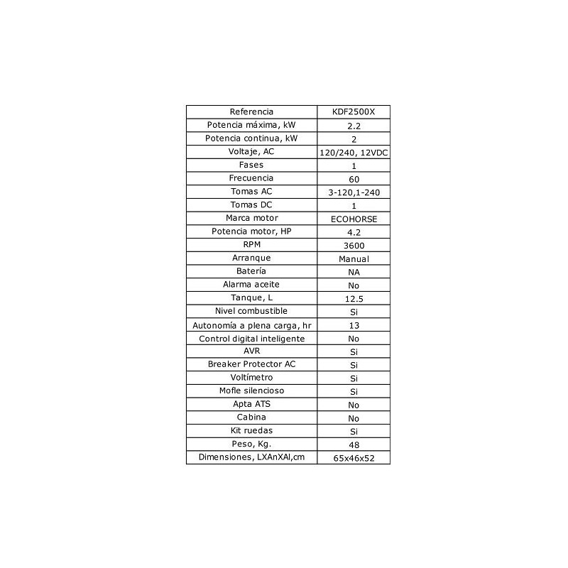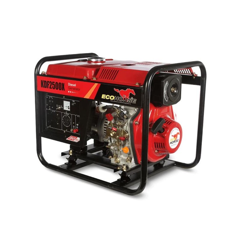 La Planta Eléctrica Diésel Ecohorse 2.2KW 110/220V KDF2500X, es un equipo de trabajo profesional con excelentes prestaciones de potencia y relacion de peso, ideal para trabajo de emergencia con uso maximo de 4 horas por ciclo de trabajo