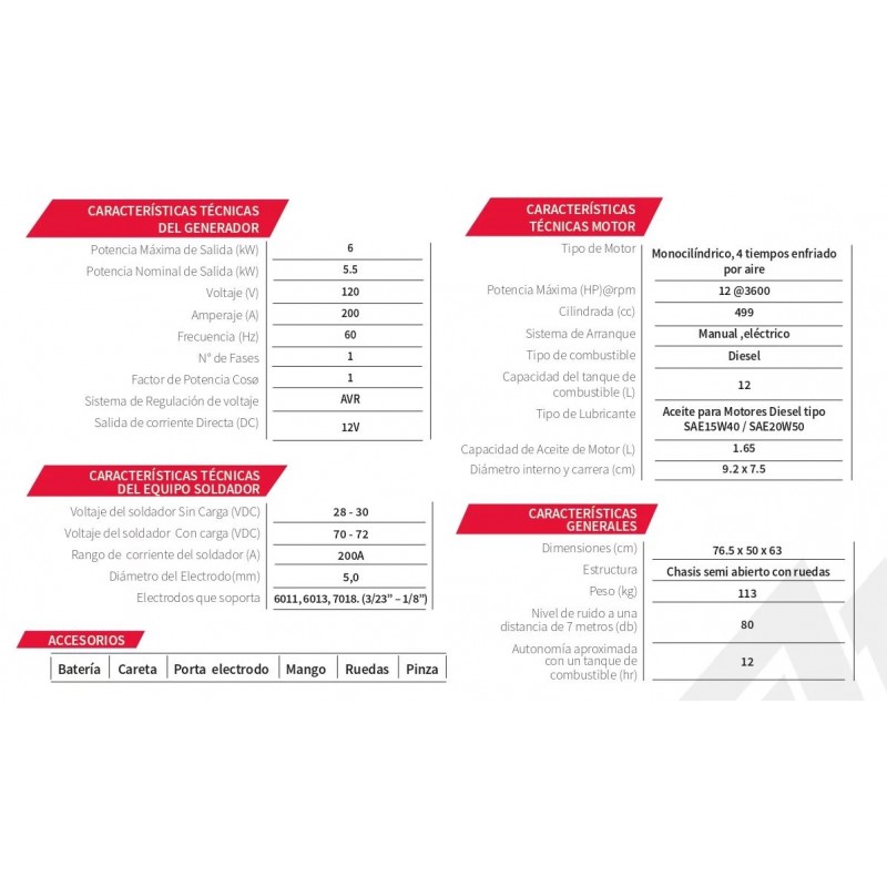 Generador con potente motor diesel de 10hp Garantía 15 meses Peso Seco 116 kg Potencia nominal 2.0 kW Funde Electrodos hasta de 1/8, Electrodo 7018 o 5/32 de E6011