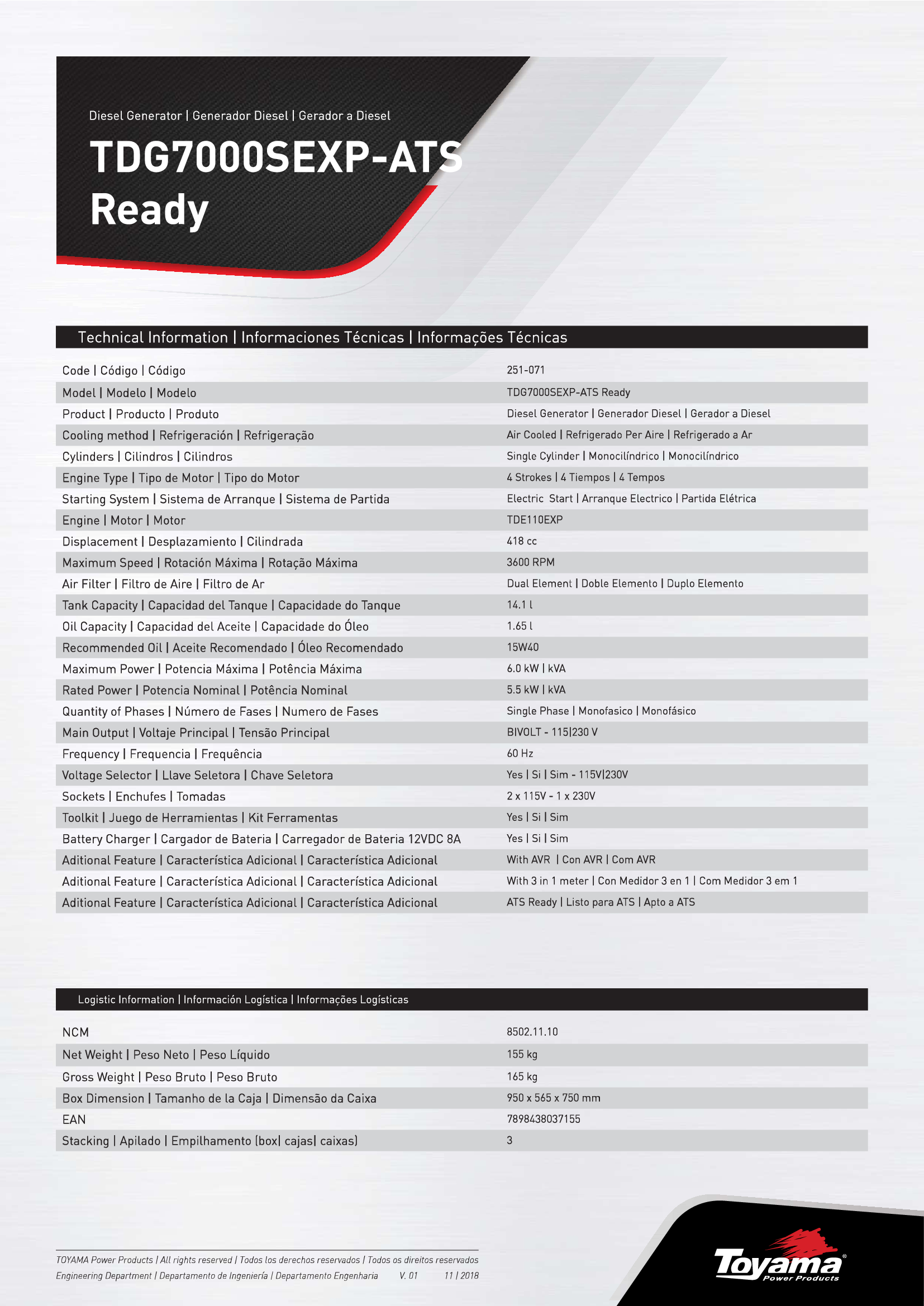 El grupo electrógeno Toyama TDG7000SEXP fue desarrollado para uso profesional. Está equipado con un motor de diesel de cuatro tiempos y 418 cc, monocilíndrico, refrigerado por aire, cabinado, arranque eléctrico y automático (ATS).