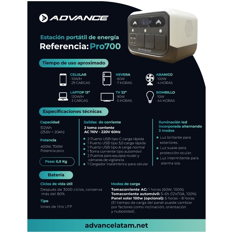 Estación Portátil de Energía Advance 700w Pro700, acumulador de corriente eléctrica ofrece 400W de potencia nominal y 600W pico, con batería de 275Wh recargable por red, vehículo o panel solar. Compacta, ligera y versátil, cuenta con múltiples salidas (AC, USB, 12V y carga inalámbrica) e iluminación integrada, ideal para emergencias, camping y trabajo móvil.