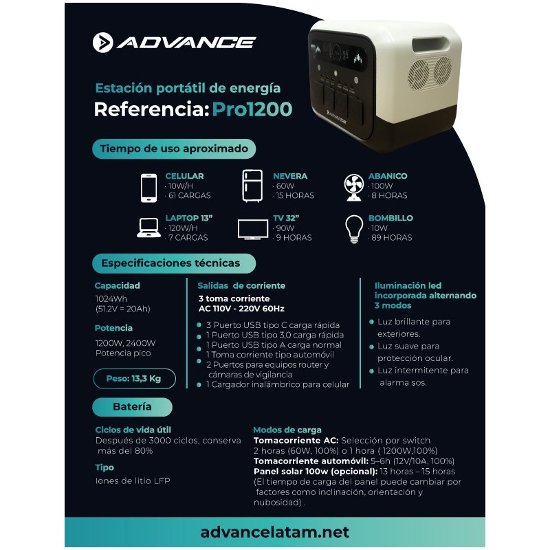 Estación Portátil de Energía Advance 700w Pro700, acumulador de corriente eléctrica ofrece 400W de potencia nominal y 600W pico, con batería de 275Wh recargable por red, vehículo o panel solar. Compacta, ligera y versátil, cuenta con múltiples salidas (AC, USB, 12V y carga inalámbrica) e iluminación integrada, ideal para emergencias, camping y trabajo móvil.