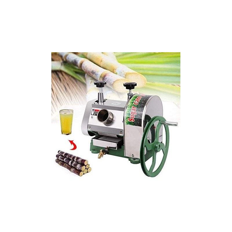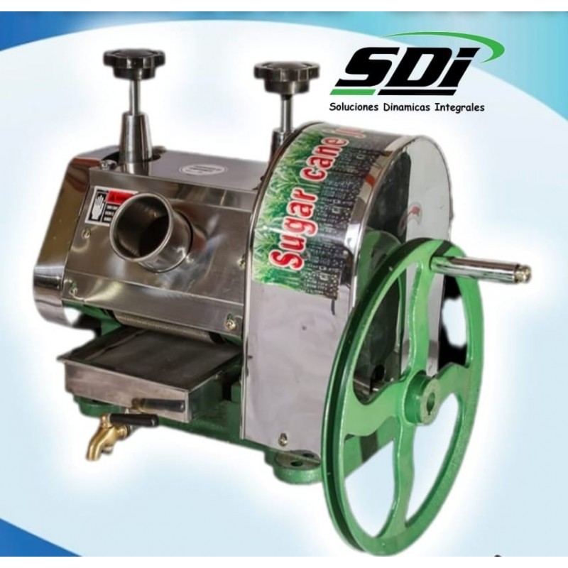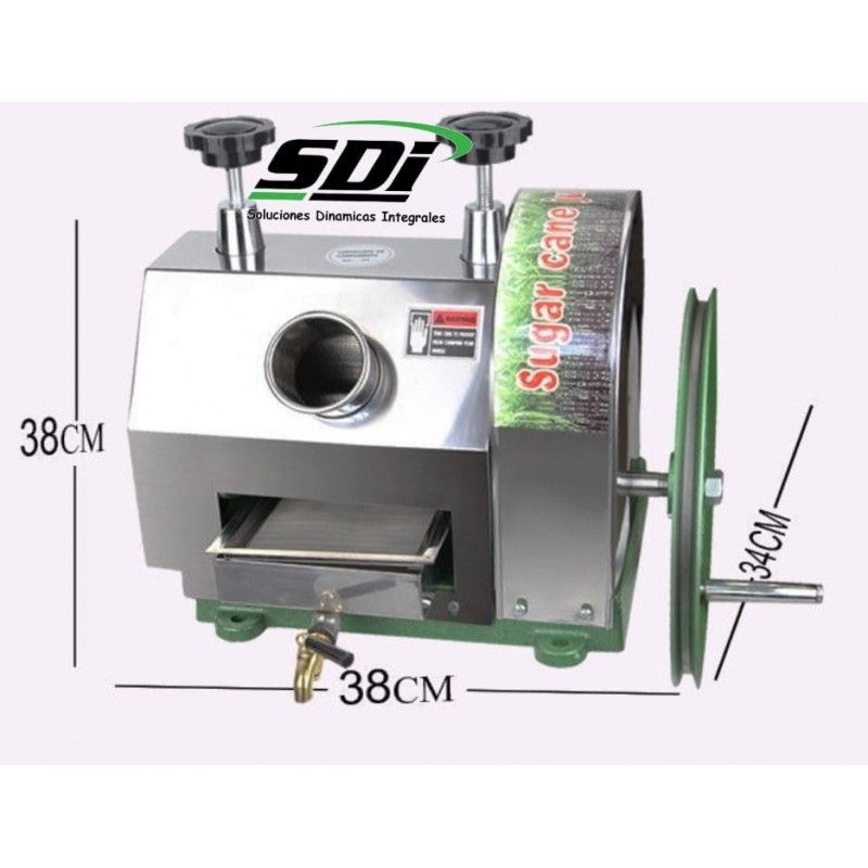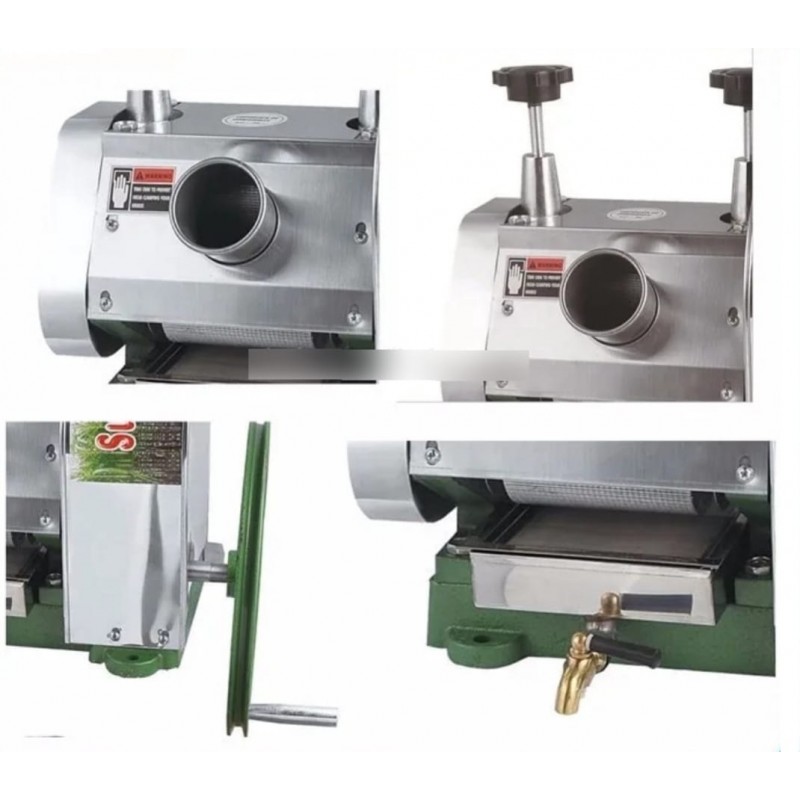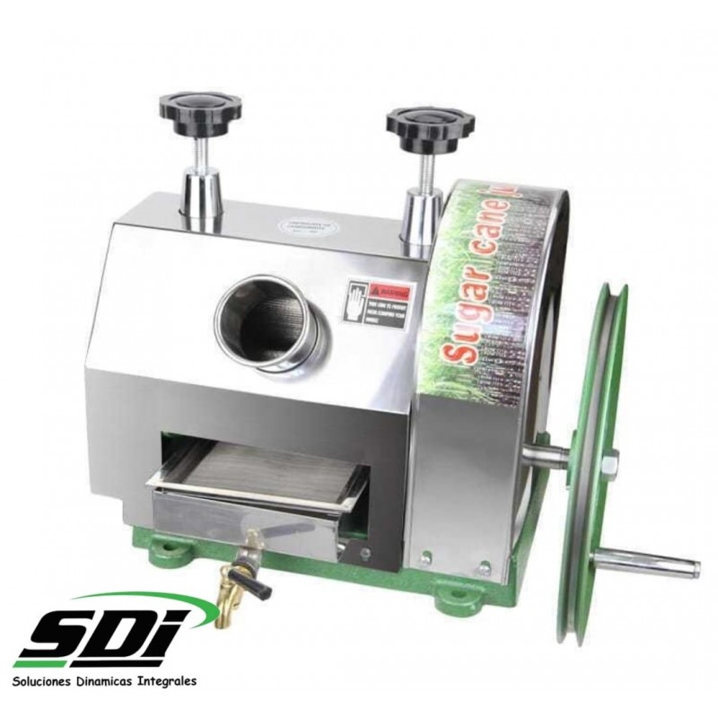 Máquina para exprimir caña de azúcar, con rodillos especiales no contaminantes, malla en acero, bandeja para decepcionar el jugo de caña con cedazo y grifo, sistema automático par giro de retroceso, que solucionará los atascos y se podrá calibrar la distancia entre los rodillos. Es óptimo para iniciar un negocio o microempresa de jugo de caña.