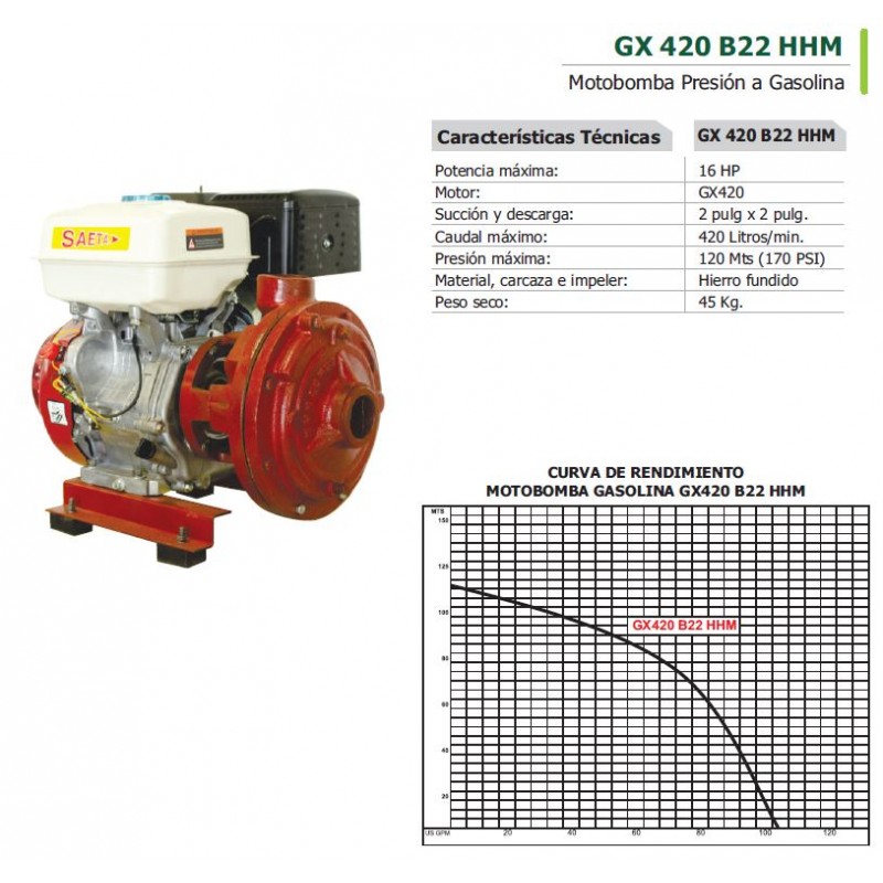 BOMBA ALTA PRESIÓN DOBLE IMPELER 2*2 MOTOR A GASOLINA 16HP - ALTURA MAXIMA 120 MTS - CAUDAL MAXIMO 420 LPM
