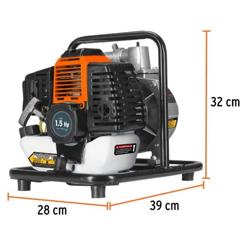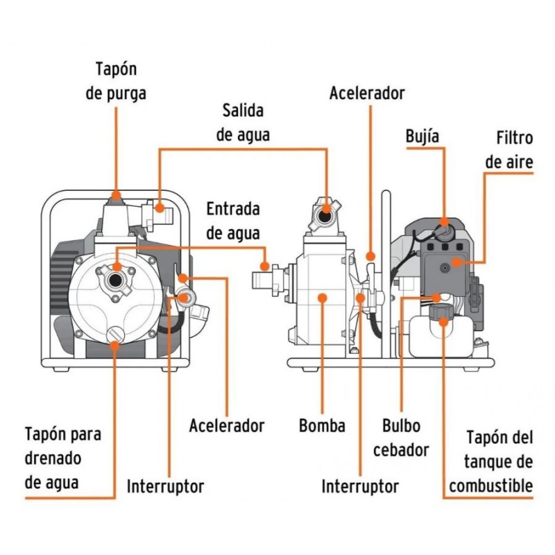 Motobomba Motor 2T de 41.5cc, 8000 rpm, Cap tanque 1 lt, Carburador de Diafragma Walbro, Caudal Maximo 320 lpm, Altura Maxima 30 Mts