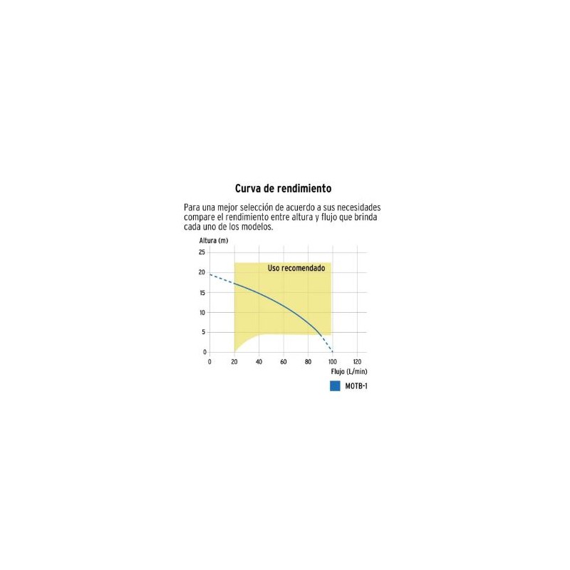 Ideal para sistemas de riego, bombeo de pozos, agricultura y construcción. Para zonas de difícil acceso a electricidad. Se utiliza para trasladar grandes cantidades de agua limpia. Altura máxima: 20 m. Flujo máximo: 100 L/min. Máxima profundidad de succión: 5 m.