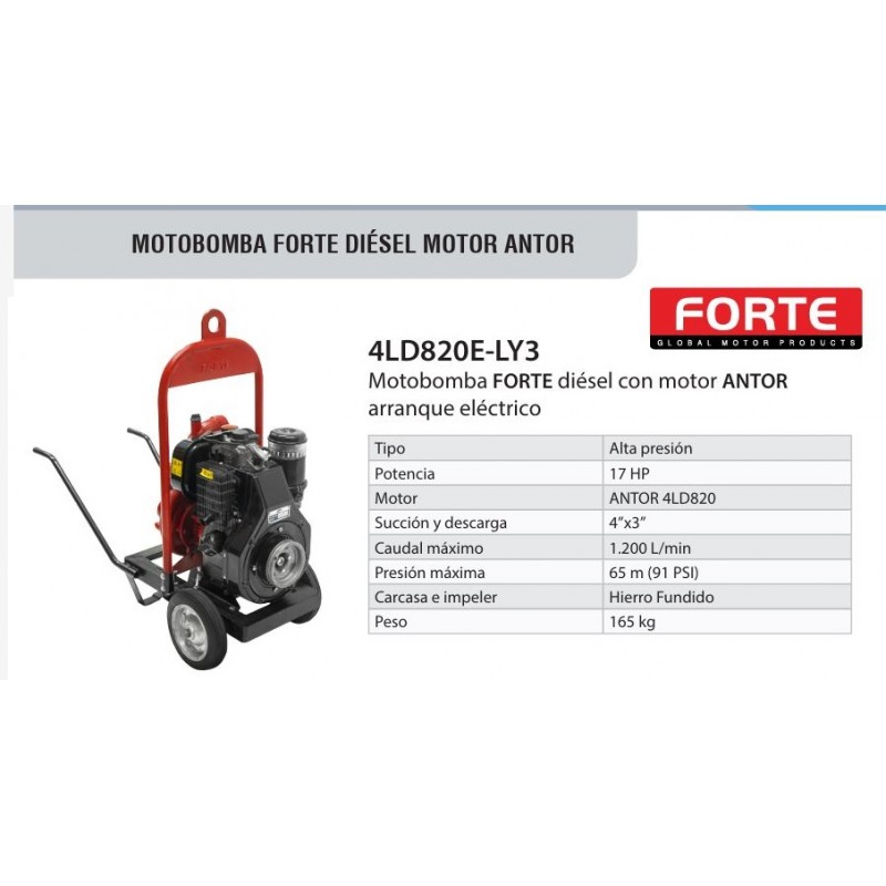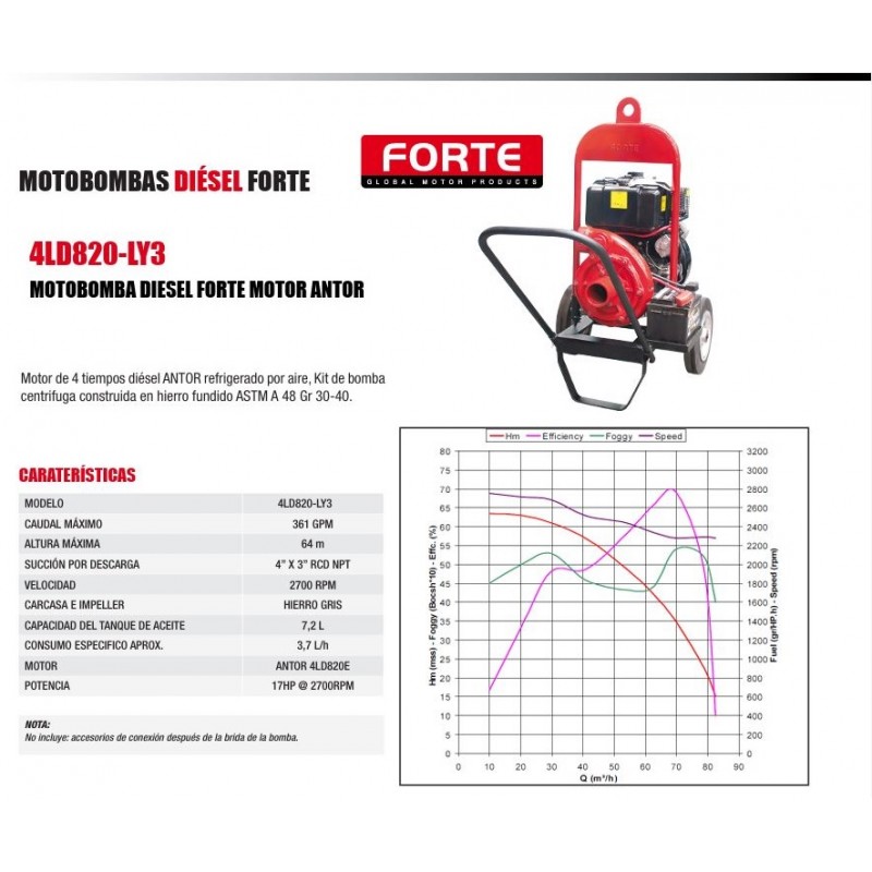 La motobomba FORTE diésel con motor FORTE está diseñada para suplir las necesidades de bombeo, son ideales para aplicaciones donde las distancias de bombeo son significativas y las presiones requeridas por el sistema son elevadas, por ejemplo agricultura, minería. Arranque Electrico