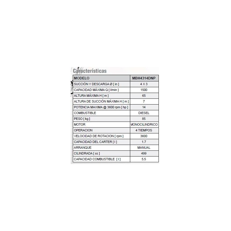 MARCA: Kama, Potencia neta (hp): 10 Capacidad tanque combustible (l): 5.5 Diámetro succión x descarga (in): 3 x 3 Cabeza máxima (m): 80 Caudal máximo (lpm): 850 Motor: KM186FAPK Garantía: 1 Año