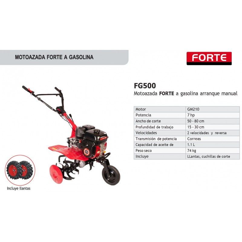 Motoazada FORTE a gasolina, arranque manual, ancho de corte 50-80 cm y su profundidad de trabajo es de 15-30 cm con 2 velocidades y reversa, incluye llantas y cuchillas de corte.