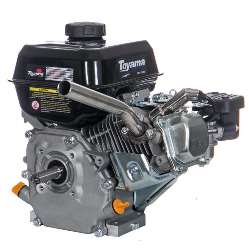 Motor Toyama Gasolina de 9.0 hp y un cilindrado de 270 cc, monocilindrico, eje horizontal, 4 tiempos, inyección directa de combustible. El díametro de su eje es de 1" y de forma chavetado. Parida manual