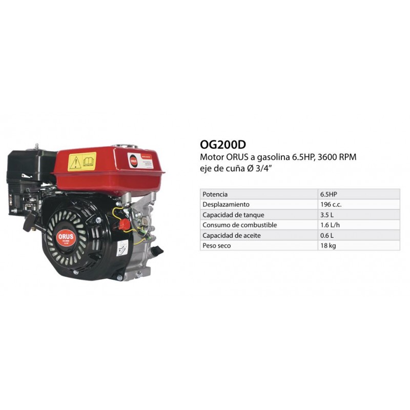 Motor ORUS a gasolina 6.5HP, 3.600 rpm eje de cuña Ø 3/4"