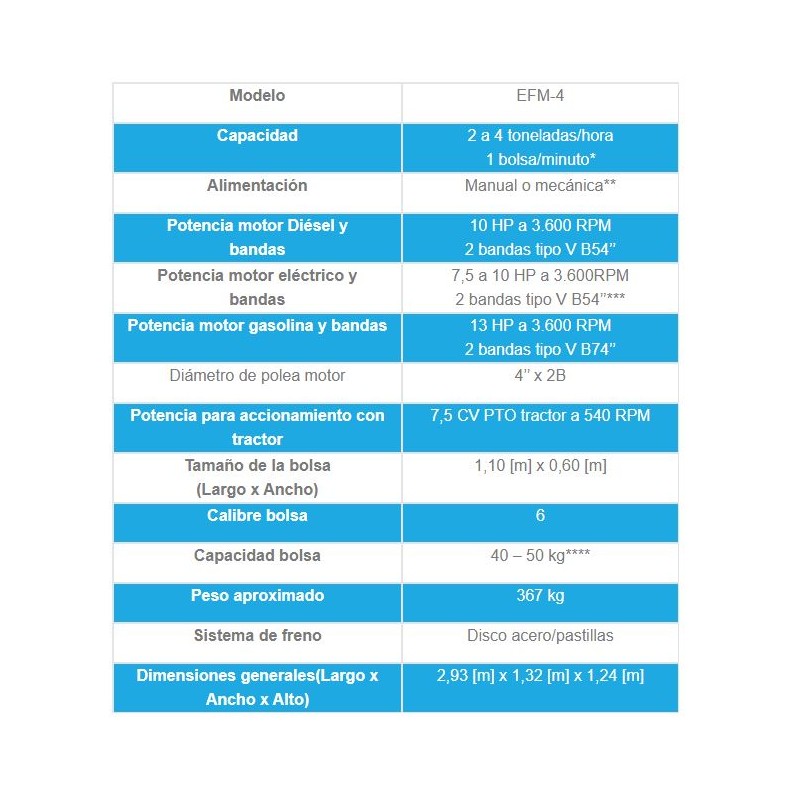 | Capacidad | 2 a 4 toneladas/hora 1 bolsa/minuto* |