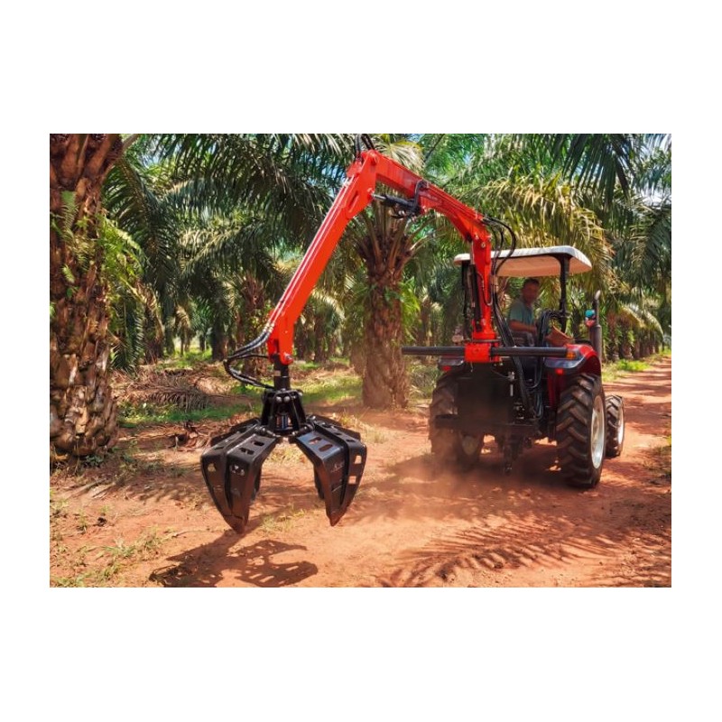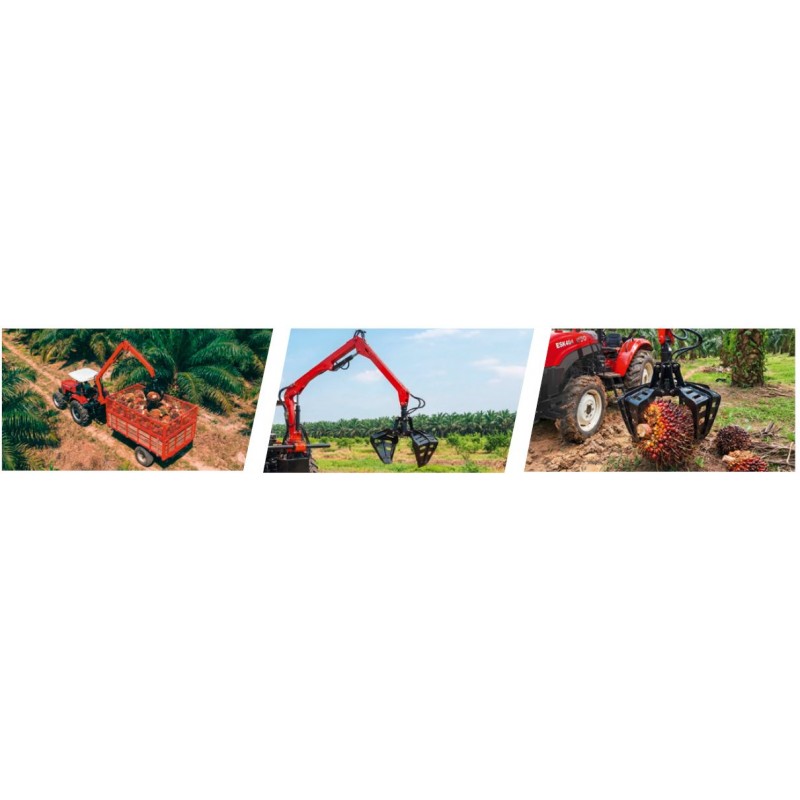 Sistema accionado por PTO. Incluye un conjunto hidráulico completo: bomba de presión, tanque de reserva y válvulas direccionales. Este implemento optimiza los tiempos de trabajo sin sobrecargar el sistema de su tractor, destacándose en labores de recolección y carga rápida de racimos de corozo de palma en remolques.