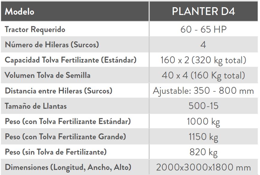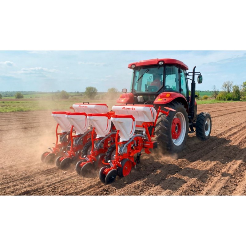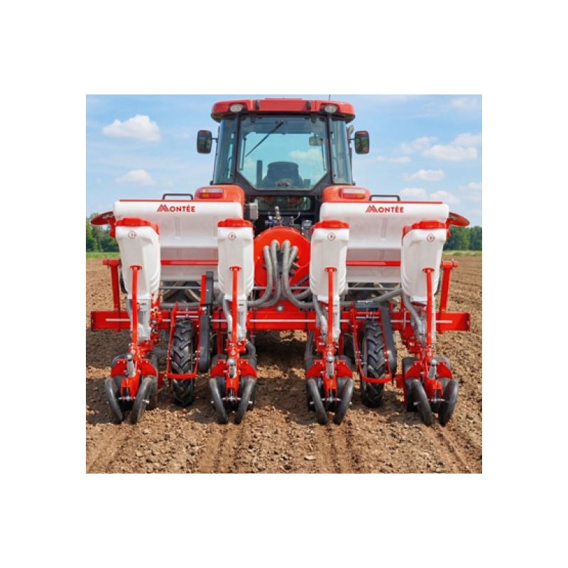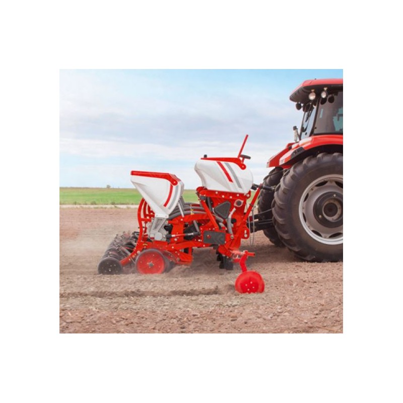 Esta sembradora de 4 hileras ofrece un sistema neumático de vacío con discos de alta precisión que garantizan una siembra