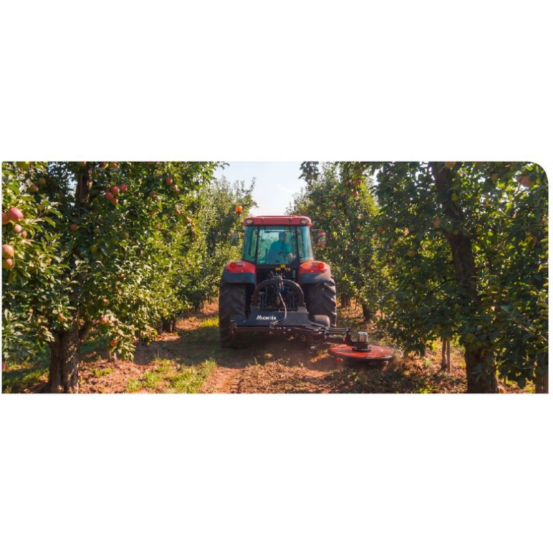 Diseñada para el mantenimiento de precisión, es una solución para segar entre frutales, hileras y alrededor de los troncos. Su gran ventaja es la adaptabilidad: cuenta con un sistema de desplazamiento lateral y una capacidad de inclinación de cabezal, lo que le permite trabajar en terrenos con pendiente lateral o cultivos plantados en “V” sin dañar la plantación.